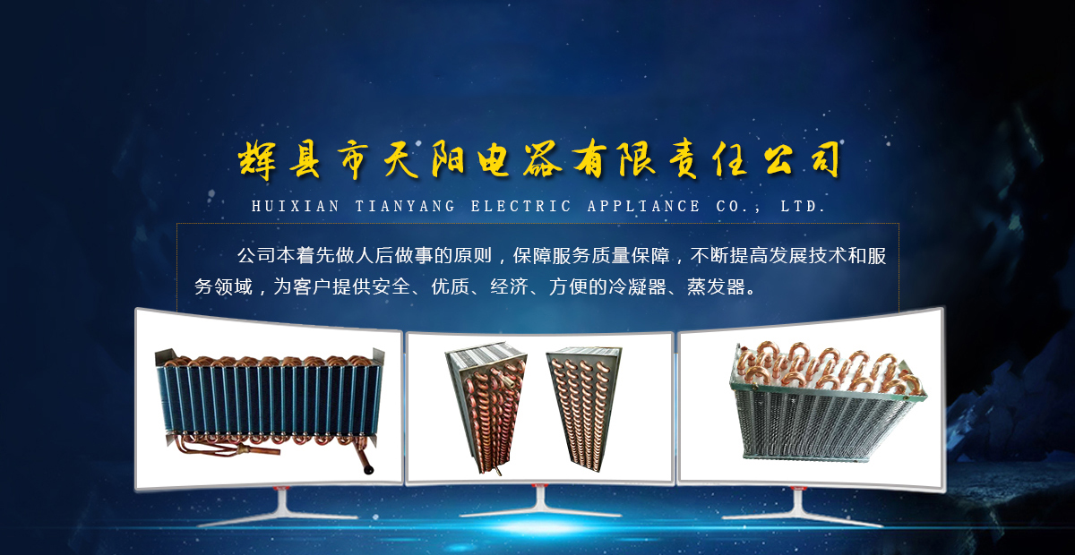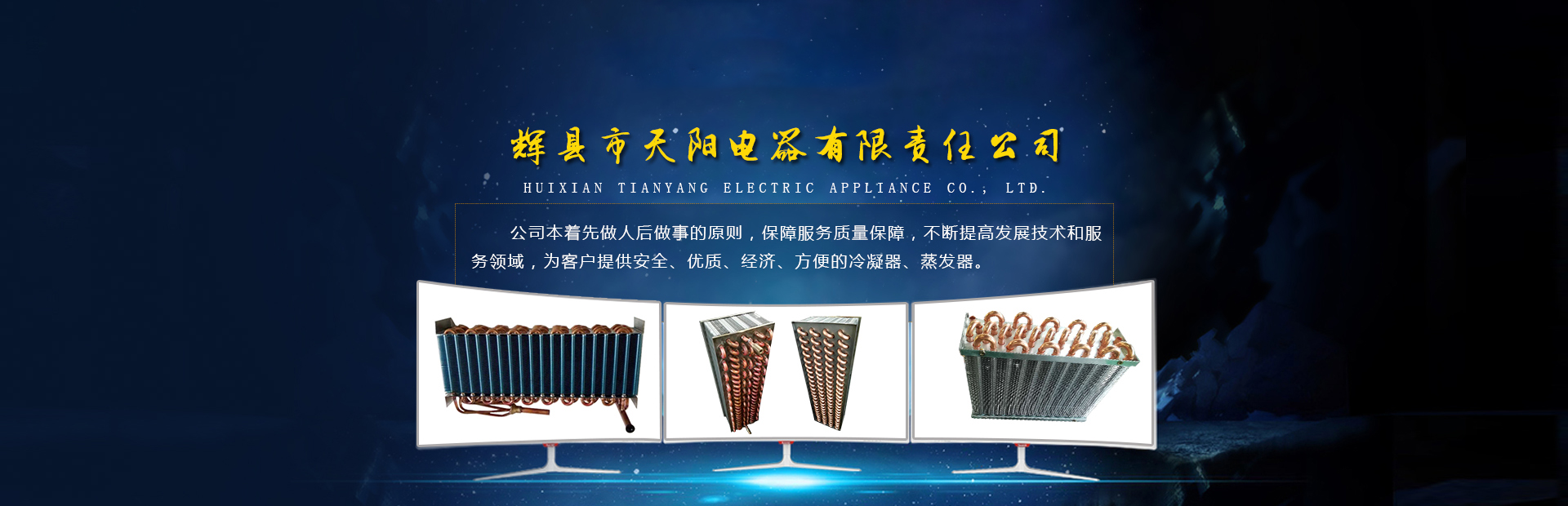 輝縣天陽電器有限責(zé)任公司位于肥沃的中原河南省輝縣市學(xué)院路中段工業(yè)集聚區(qū)興業(yè)園3號廠房,以制冷設(shè)備用冷凝器,蒸發(fā)器,熱交換器為主。主要材料為銅管鋁翅片,銅管銅翅片,鋁管鋁翅片。廣泛應(yīng)用于冰箱冰柜,制冷設(shè)備,暖通設(shè)備,空調(diào),自動售貨機,冷干機,超市立風(fēng)柜,冷藏車,烘干機等產(chǎn)品領(lǐng)域。  公司自1998年成立以來,始終堅持:“科技造就產(chǎn)業(yè)、質(zhì)量成就信譽、誠信鑄就輝煌”的質(zhì)量方針,從產(chǎn)品拓展上堅持“人無我有,人有我優(yōu),人優(yōu)我特的”經(jīng)營理念,25年來,從1998年開始供應(yīng)河南冰熊集團(tuán)下屬的冷柜廠,制冰機廠各種冷凝器;2003年之后,原冰熊集團(tuán)的精英志士開始在全國各地發(fā)展,所到之處依托我公司供貨,以致于多家目前已具行業(yè)中佼佼者的公司,從而建立了如凱雪公司,兆邦公司、凌云公司、海寶公司、正雪公司、上海忠云、山東德萊維等幾十余家公司在草創(chuàng)時期的啟蒙供貨商,友好共贏長達(dá)十余年,成為我國制冷行業(yè)的供應(yīng)商。以致在2015年初雙匯集團(tuán)面向社會的招標(biāo)書中指名要我公司冷凝器、蒸發(fā)器指定產(chǎn)品供應(yīng)商